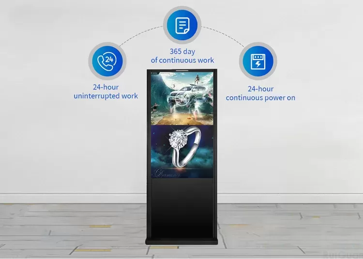 Mesin iklan 55 inci adalah salah satu ukuran paling populer dalam aplikasi komersial. Resolusi 4K ultra-high-definition dikombinasikan dengan area layar yang lebih besar dapat secara efektif menarik perhatian penonton. Ini banyak digunakan di atrium pusat perbelanjaan, lorong stasiun kereta bawah tanah, ruang pameran besar dan area ramai lainnya. Mesin iklan dengan ukuran ini memiliki ekspresi yang lebih kuat dalam tampilan konten dan cocok untuk memutar iklan video dinamis atau konten interaktif. Jarak tampilan yang disarankan adalah 3-5 meter. Mesin iklan 65 inci adalah produk signage digital besar. Dibandingkan dengan produk 55 inci, area tampilan telah meningkat sekitar 40%. Sangat cocok untuk acara-acara yang membutuhkan dampak visual yang lebih besar, seperti toko 4S mobil, area tampilan produk unggulan atau pusat konferensi besar. Ukuran ini biasanya menggunakan panel kecerahan tinggi (di atas 700cd / m²) untuk memastikan visibilitas di lingkungan yang cerah. Penahan beban dan stabilitas yang memadai perlu dipertimbangkan selama pemasangan. Mesin iklan 75 inci telah memasuki kategori ukuran super besar. Area tampilan setara dengan empat layar 55 inci, yang dapat menciptakan pengalaman visual yang imersif. Ini sering digunakan di ruang komersial kelas atas, toko pengalaman merek atau ruang pameran perusahaan besar. Produk tersebut biasanya dilengkapi dengan sistem pendingin yang lebih kuat dan kecerahan yang lebih tinggi (di atas 1000cd / m²) untuk memenuhi kebutuhan operasi beban tinggi jangka panjang.
