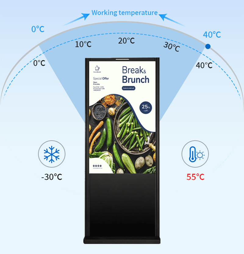 Compared with traditional static advertising (such as inkjet posters and light boxes), although the initial purchase cost of outdoor vertical advertising machine is higher, the subsequent maintenance and content update cost is extremely low. Traditional advertising needs to change the screen regularly, resulting in repeated costs such as printing and manual installation, while the advertising machine only needs to update the content remotely through the background, greatly reducing long-term operating expenses.