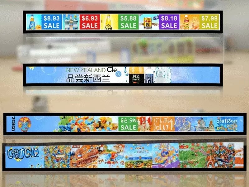 Retail shop wall mounted strip display indoor stretched bar wide Lcd shelf advertising screen