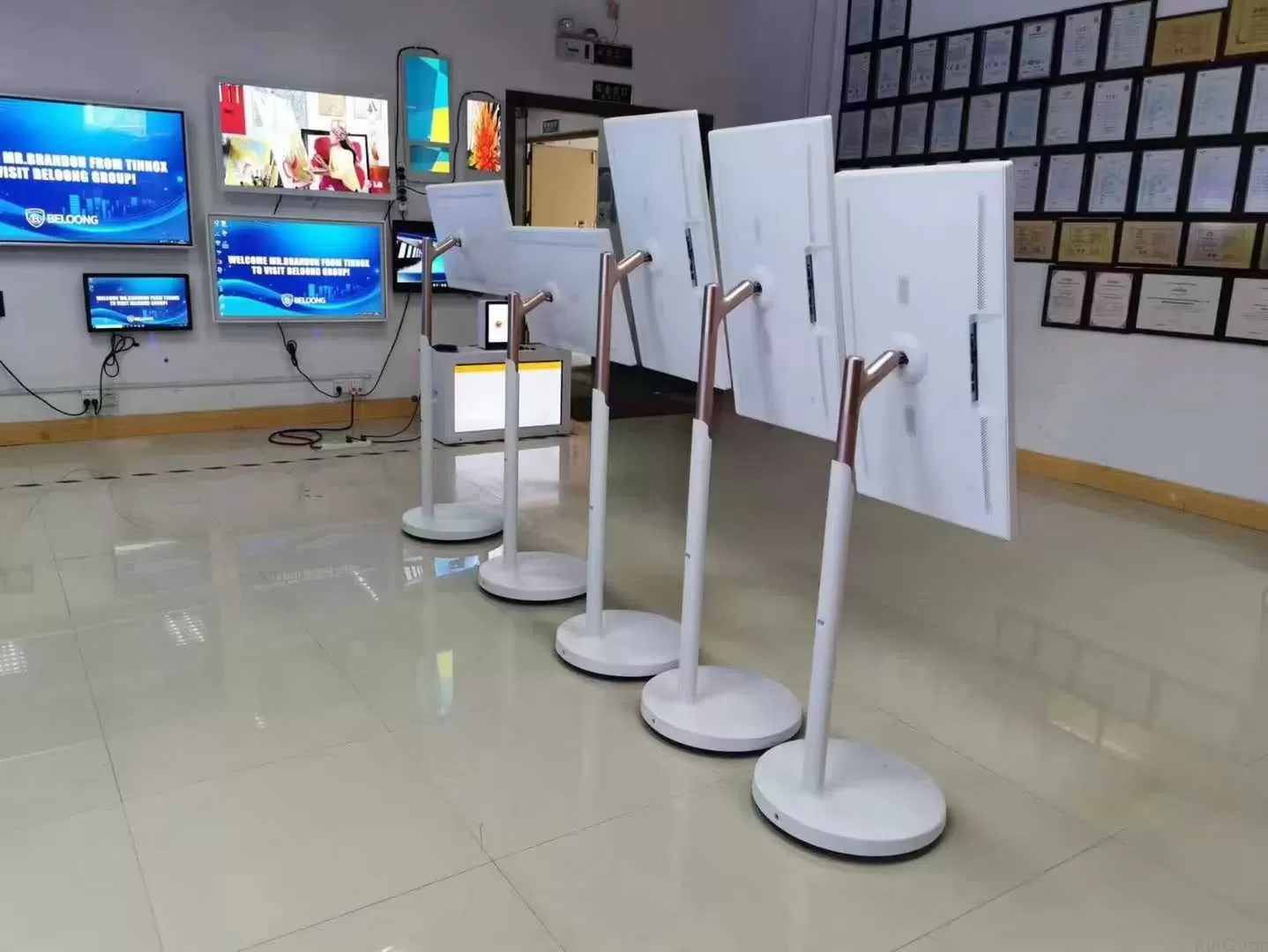 Nag-aalok ang mobile floor stand nito ng 360 rotation at 20 tilt, habang ang mga omnidirectional wheel ay ginagawang walang hirap ang paggalaw. Ang unit ay ginawa mula sa matibay na plastic at aluminum alloy, na may tempered screen, na nagbibigay dito ng parehong istilo at resilience. Tinitiyak ng built-in na rechargeable lithium battery (hanggang 60,000mAh) ang mahabang oras ng paggamit nang hindi nababahala tungkol sa mga saksakan ng kuryente.
